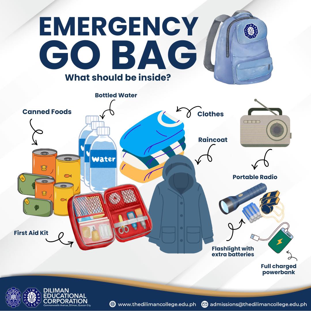 Every second matters in a crisis. Students, parents, and teachers are reminded to prepare and keep their Go Bag near the main exit of their homes. Remember, being prepared is the first step to keeping yourself, your family, and your community safe. #DC #DilimanCollege #EmergencyGoBag #BePreparedStaySafe #TransformingLearnersToLeaders