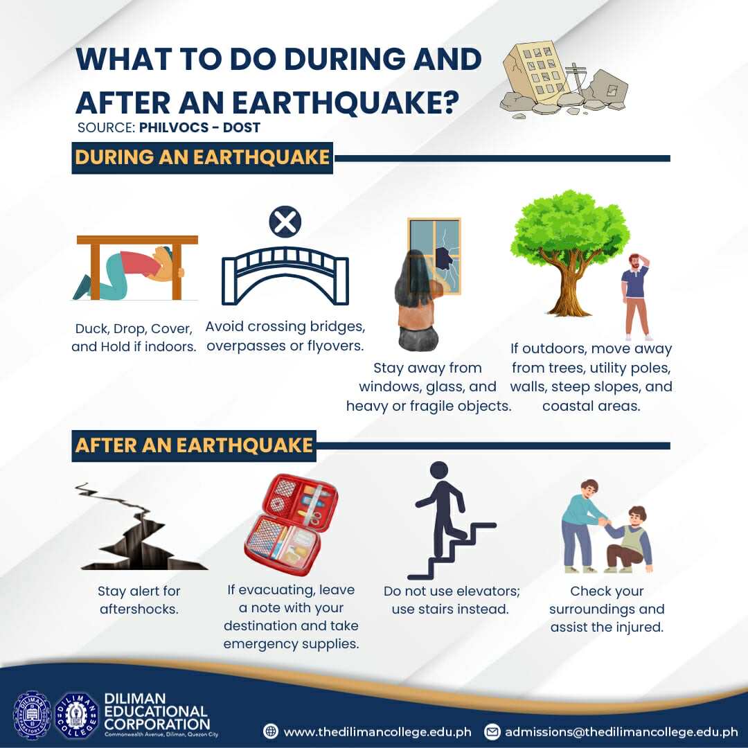Know what to do during, and after an earthquake — preparedness saves lives! #DC #DilimanCollege #EarthquakeSurvivalTips #TransformingLearnersToLeaders